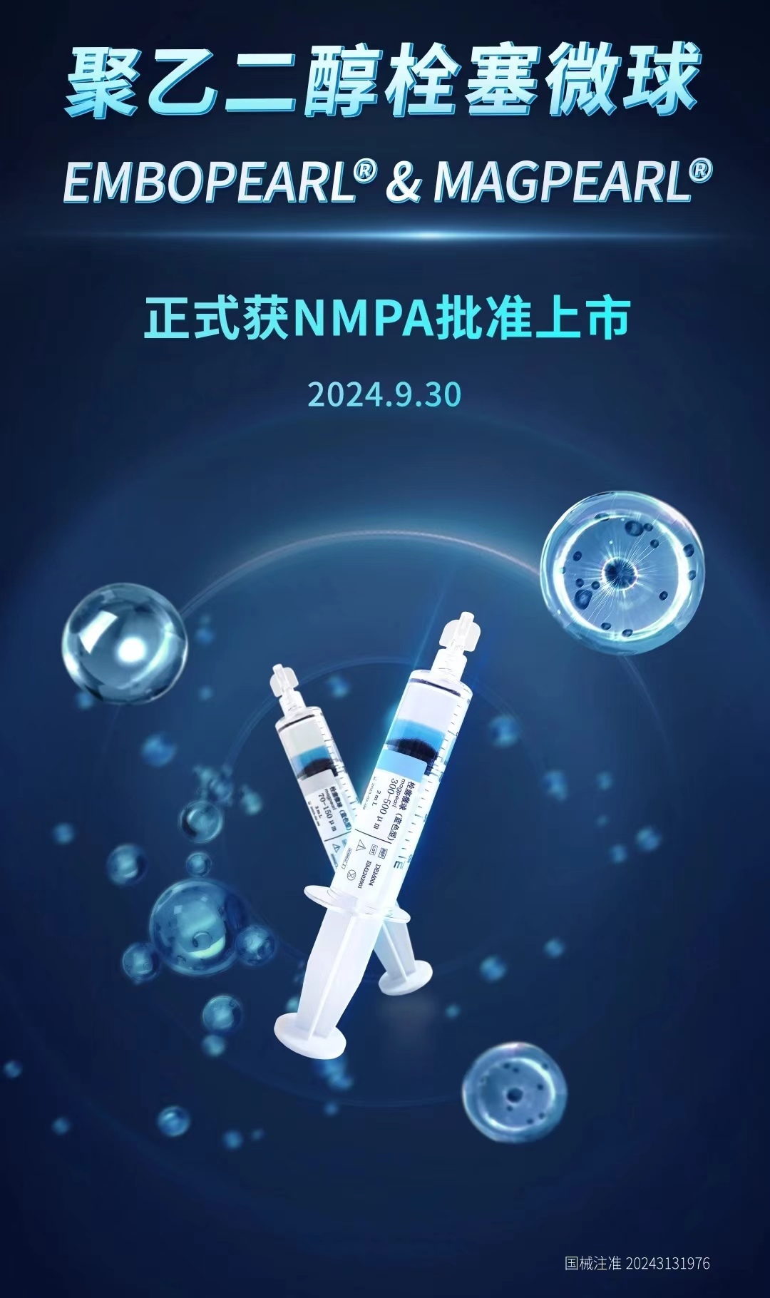 9月30日,国家药品监督管理局正式批准了上海益思妙医疗器械有限公司生产的“聚乙二醇栓塞微球EMBOPEARL® & MAGPEARL®”,国械注准20243131976。