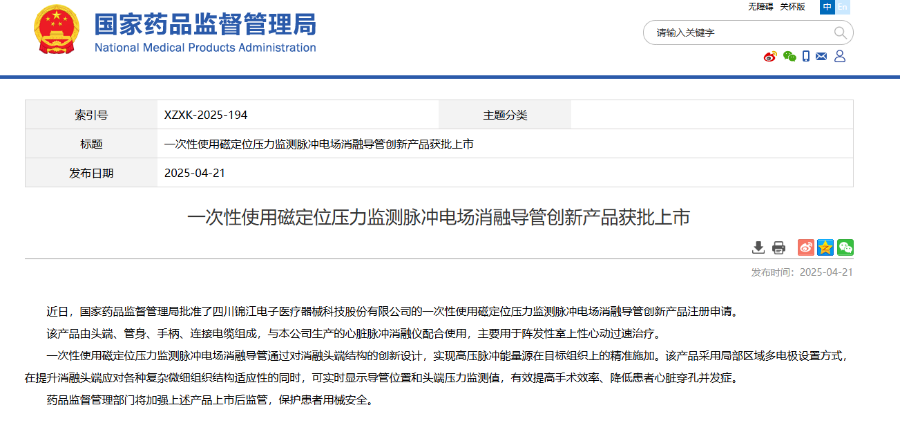 4月21日,国家药品监督管理局正式批准了四川锦江电子医疗器械科技股份有限公司生产的“一次性使用磁定位压力监测脉冲电场消融导管”。