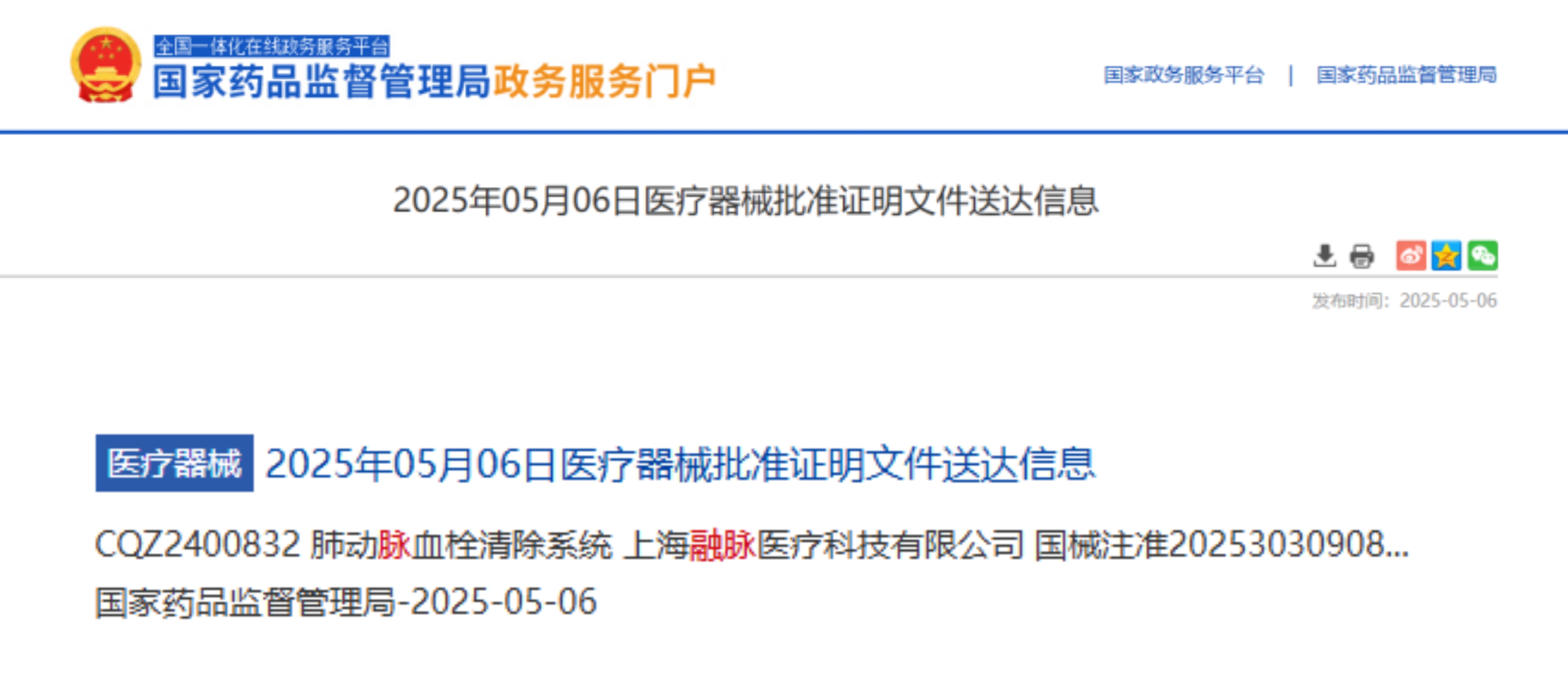 恭喜我们的合作伙伴 上海融脉医疗科技有限公司-肺动脉血栓清除系统 喜提注册证!