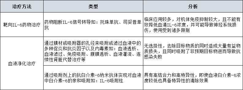 目前针对IL-6靶点的治疗手段主要包括使用药物阻断IL-6信号转导通路和血液净化清除IL-6两大方面。