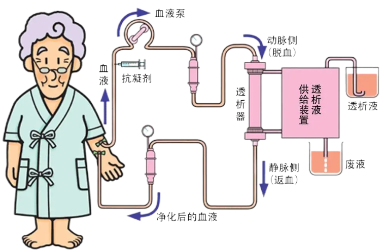 将血液引出体外,建立血管循环通路,通过半透膜弥散、物理吸附、化学反应、免疫吸附等原理的净化装置,清除掉血液当中的有害物质和水分,达到净化血液、治疗疾病的目的。