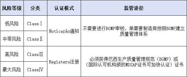 巴西医疗器械的分类规则按安全风险高低,分为ClassⅠ、ClassⅡ、ClassⅢ、ClassⅣ四个类别。