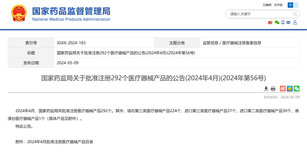 5月9日,国家药监局发布公告称,2024年4月,国家药监局共批准注册医疗器械产品292个。其中,境内第三类医疗器械产品224个,进口第三类医疗器械产品37个,进口第二类医疗器械产品30个,港澳台医疗器械产品1个。
